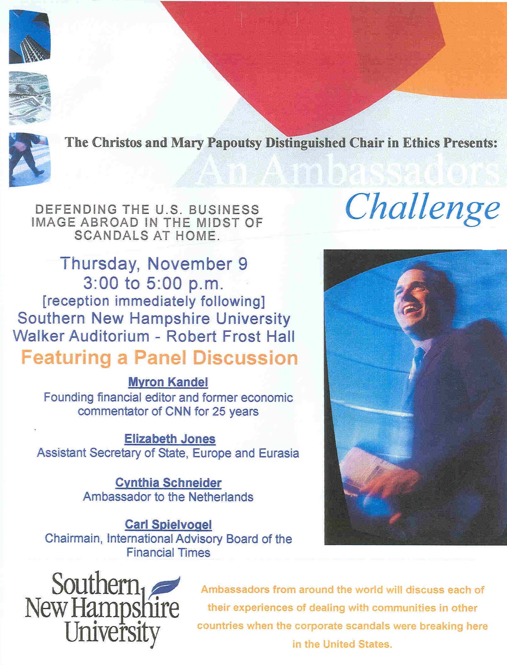 (Posting date 26 October 2006) HCS readers are invited to view other articles about SNHU or business ethics at our extensive, permanent archives under the Business Ethics section at the URL http://www.helleniccomserve.com/archivebusinessethics.html or the Christos and Mary Papoutsy Distinguished Chair in Business Ethics at Southern New Hampshire University at http://www.helleniccomserve.com/archivepapoutsychairbizethics.html. The purpose of the distinguished chair in ethics is to promote and enhance students’ and community members’ awareness of ethics in personal and professional settings through teaching, community lectures and conferences. These events will foster understanding and assist in the application of lessons taught by current and classical ethicists to 21st-century settings.The chair serves as the cornerstone for an integrated university program in business ethics that encompasses the undergraduate and graduate levels. For more information about these events or about the ethics chair, contact Jane Yerrington at SNHU (603-668-2211 x2488) or visit the webpages of the ethics chair at http://www.snhu.edu/1301.asp.  |