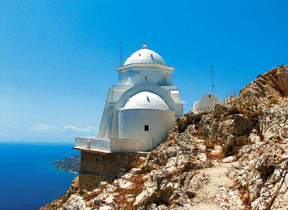 The biggest rock in the Mediterranean? It is quite a thought. And the ascent is made a touch surreal by the prospect of meeting the mad monk who serves alcohol at the top. At least, that is the information that Jethro Tull's Anderson (who has, it turns out, been to Anafi before) passed onto Nick the illustrator. It seems an ever more absurd idea, the higher you get. A halo of wispy cloud swirls round the peak and on rounding the final bend the wrinkled surface of the Aegean is, abruptly, just a footstep away. The drop on this side is almost sheer. And in front, clipped right to the top of the rock in a gesture of both architectural daring and monastic exuberance, is Kalamiotissa. It is deserted and locked. No mad monk, no alcohol. Just the top of the world. So the idea was absurd.  |