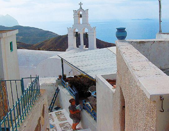 Thanks to the town's design and location it is not hard to find a room with a sunset view over the Aegean and Anafi's three little islets - Ftena, Pahia and Makria. And travellers from the Nisos Thira end up on roughly the same contour lines, which means they keep bumping into each other. It seems to me that Ftena should really be Ftera (φτερά) because it looks as though it has a pair of wings. "Here and now it does," says Nick, who is in the middle of giving Jethro Tull's lead singer and flautist Ian Anderson a drawing lesson on his verandah, "but that can all change. Anyway, it depends if you want it to have wings."  |