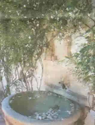Pots, used as accents, retain a significant role in the Andalusian patio - the geometrical arrangements are carefully arranged to create a succession of seasonal favourites. Plants are brought centre stage and then withdrawn and replaced once their feature of interest has passed - be that bloom, leaf colour or scent. Each plant is shaped and groomed, placed on show and meant to be seen from every angle. In the summer the patios are covered with canvas during the day, and the paving slabs damped down to increase humidity. Foliage becomes predominant at this time large pots of ferns supplemented by wispy Asparagus tenuifolius, clipped balls of box and other evergreens guaranteed to withstand the heat.  |