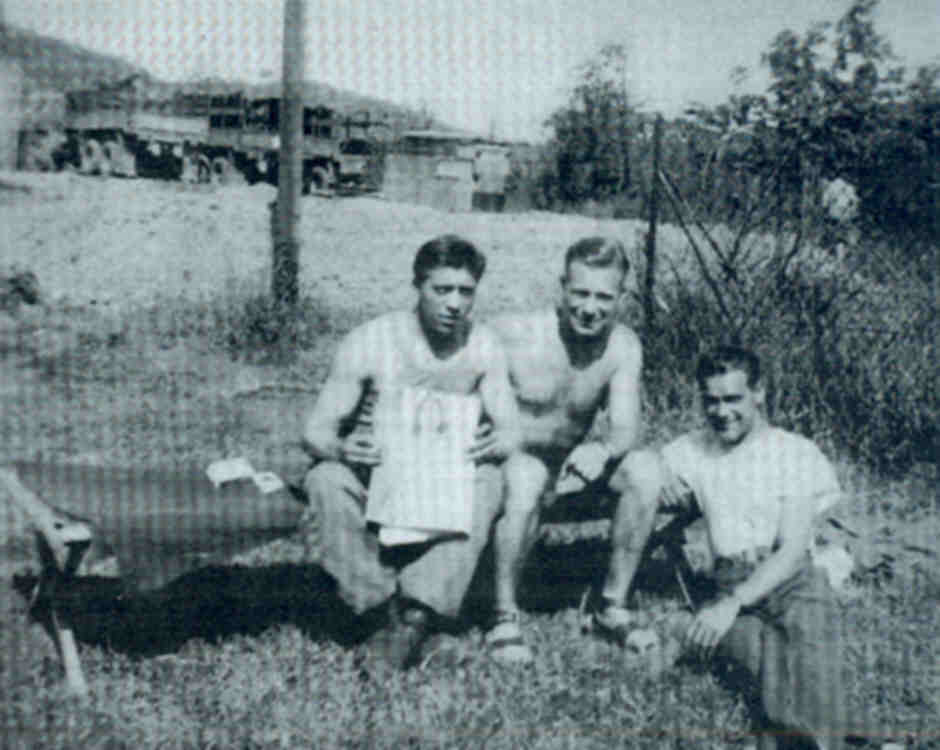 ![]() Three WWII soldiers sitting on a cot (L to R) "The Italian," John Ray Underwood and Angelo S. Klonis, take respite from the war  |