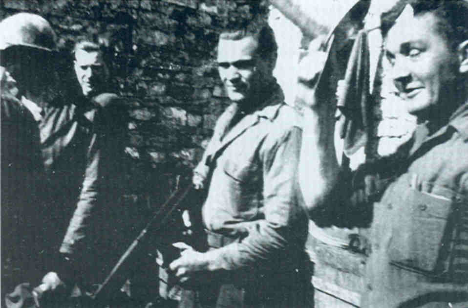 ![]() Nick Klonis holding Tompson machine gun in a special Rangers mission, with PFC John Ray Underwood on the right  |