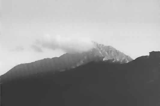 ![]() The summit of the Athos peninsula, Mount Athos, shrouded in clouds, seen from the Bourazeri community  |