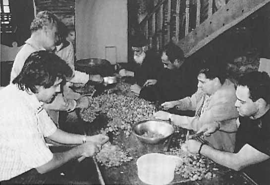 ![]() Greek pilgrims, amny of whom flock to Athos for confession and spiritual uplifting, break almonds at Grigoriou Monastery for the wheat kolyva, eaten after a memorial service  |