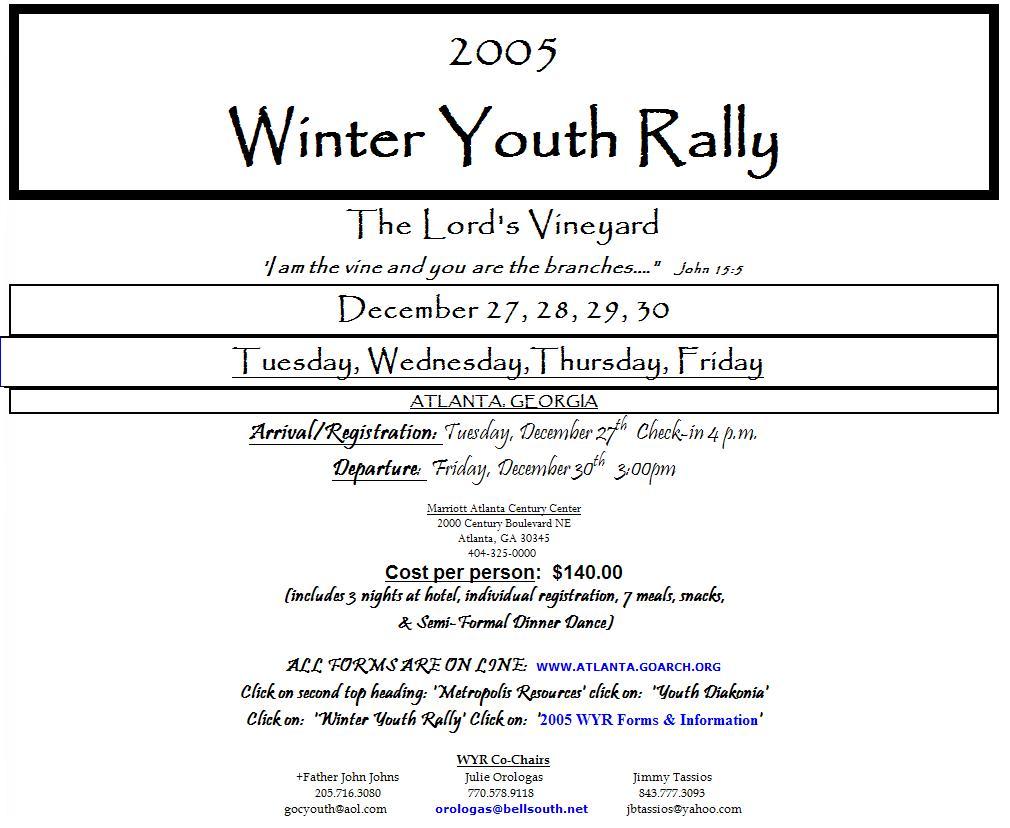 To read an overview letter from the members of the Executive Board of the Winter Youth Rally, click here. The organization has included important instructions and participation restrictions: click here to read these. All forms can be found online at the metropolis website at the URL http://www.atlanta.goarch.org. For a complete list of the members of the Executive Board for the annual Winter Youth Rally, click here.   |