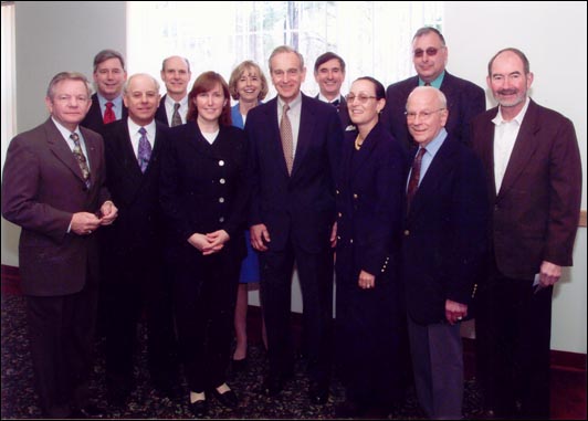 (Left to right, front row) Dr. Richard Gustafson, President of Southern New Hampshire University; Christos Papoutsy, Advisory Board; Maryann Murphy, Vice President of Planning and Marketing for PAX World Fund Management Corporation; James A. Autry, keynote speaker; Mary Papoutsy, Advisory Board; Dr. John C. Rouman, Advisory Board; David Myler, Advisory Board; (back row) J. Michael Hickey, President of Verizon of New Hampshire; Theodore Krantz, Advisory Board; Prof. Eleanor Dunfey-Freiburger, holder of the Christos and Mary Papoutsy Endowed Chair in Business Ethics at Southern New Hampshire University; Richard Kimball, Advisory Board; Dr. Richard Clairmont, Advisory Board.