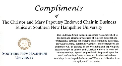 Portsmouth, NH-On Friday, April 25, 2003, the School of Business and the Christos and Mary Papoutsy Endowed Chair in Business Ethics sponsored a symposium in business ethics at Southern New Hampshire University (SNHU) in Manchester, New Hampshire. Professor Eleanor Dunfey-Freiburger, the first appointee to the endowed chair at SNHU, organized the symposium and served as Master of Ceremonies. Leading the first morning session of the symposium was J. Michael Hickey, President of Verizon in New Hampshire. The topic of his talk was "Organizational Management and Structure: What is the Human Equation?" Mariann Murphy, Vice President of Planning and Marketing for PAX World Fund Management Corporation, presented "Transparency and Board Governance" in the second session. Question-and-answer and discussion periods followed both sessions.