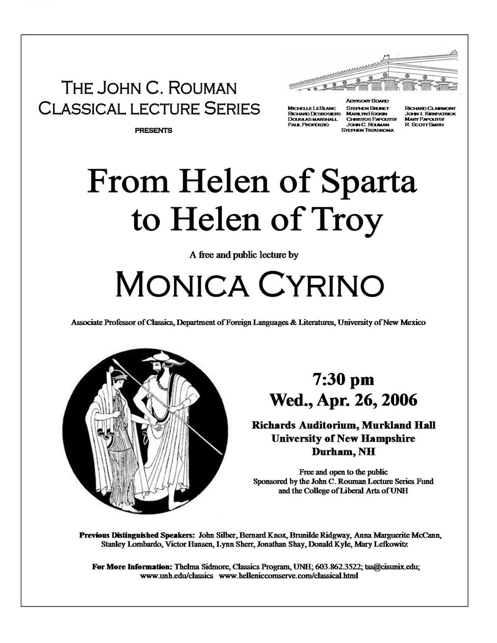 2006 26 April 2006, Wednesday, 7:30pm--Free public lecture--Richards Auditorium, Murkland Hall, University of New Hampshire, Durham, NH--"From Helen of Sparta to Helen of Troy" by Dr. Monica Cyrino, Chairperson of the Classics Program, University of New Mexico. 18 October 2006, Wednesday, 7:30pm--Free public lecture--Richards Auditorium, Murkland Hall, University of New Hampshire, Durham, NH--"From House to Church: Charting the Course of Artistic Transformations in the Early Byzantine Art" by Dr. Christine Kondoleon, George and Margo Behrakis Curator of Greek and Roman Art at the Boston Museum of Fine Arts. 2007 9-10 March 2007--Annual conference of the Classical Association of New England.(CANE) at the University of New Hampshire. For more information, visit the CANE website at the URL http://www.caneweb.org/index.asp, or contact CANE President Cynthia Damon, Classics Dept., AC #3357, Amherst College, Amherst, MA 01002; (tel.) 413-542-8126 (W), 413-549-7471(H); (email) cdamon@amherst.edu 21 March 2007, Wednesday, 7:30pm--Free public lecture--Richards Auditorium, 115 Murkland Hall, University of New Hampshire, Durham, NH, by Dr. Charles Beye. Topic: Figure of Odysseus. October 2007--For the Tenth Anniversary celebration of the founding of the John C. Rouman Classical Lecture Series, legendary film producer and historian Michael Wood will speak in Durham during the week of October 22, 2007. Public welcome. New Hampshire Governor John Lynch to proclaim Classics Week in honor of events. Read more or view schedule.>>. 4 December 2007, Tuesday, 1-3:30pm--Free public lecture--Huddleston Ballroom, University of New Hampshire, Durham, NH, by Greek Ambassador Alexandros Mallias. Reception afterward hosted by College of Liberal Arts, led by Dr. Marilyn Hoskin, Dean. Tenth Anniversary celebration of the founding of the John C. Rouman Classical Lecture Series at UNH. 2008 12 March 2008, Wednesday, 6:00pm--Free public lecture--Richards Auditorium, 115 Murkland Hall, University of New Hampshire, Durham, NH, by Dr. Kurt Raaflaub, President of the American Philological Association: "Live Free or Die: Liberty, Democracy and Imperialism in Ancient Athens." Jointly sponsored by the John C. Rouman Classical Lecture Series and the Democracy Dialogue on Campus Program at the University of New Hampshire. 27-30 June 2008--61st Annual American Classical League Institute for Latin students and teachers--University of New Hampshire. More details to follow. 22 October 2008, Wednesday, 7:30pm--Free public lecture--Richards Auditorium, 115 Murkland Hall, University of New Hampshire, Durham, NH, by Dr. Jeffrey Henderson, William Goodwin Aurelio Professor of Greek Language and Literature, former Dean of the College and Graduate School of Arts & Sciences at Boston University: "Pericles the Squill-Head: Political Humor in the World's First Democracy." John C. Rouman Classical Lecture Series. 2009 05-08 March 2009--Theatre performance--7pm on March 5-7, 2pm on March 8--Strafford Rm., UNH campus. Medea, adaptation by Robinson Jeffers for the Mask and Dagger Theatre Troupe of UNH. Tickets $3/students, $5 all others. Produced with special permission of Samuel French, Inc. 01 April 2009, Wednesday, 7:30pm--Free public lecture--DeMerritt 240, University of New Hampshire, Durham, NH, by Dr. Stratis Papaioannou, William A. Dyer, Jr. Assistant Professor in the Humanities at Brown University and Dumbarton Oaks Asst. Prof. of Byzantine Studies in Washington, D.C.: "The Unknown Narcissus: Mirrors in Byzantium." Reception following lecture. The John C. Rouman Classical Lecture Series. October 2009--Free public lecture--Richards Auditorium, 7:30pm, Murkland Hall, University of New Hampshire, Durham, by Dr. Barry Strauss, world-renowned author and Cornell University professor: "The Trojan War: Myth or History?" MReception following lecture. The John C. Rouman Classical Lecture Series. 2010 21 April 2010--Free public lecture on Classicist Edith Hamilton: Edith Hamilton and New England: The Making of a Revolutionary Classicist--University of New Hampshire, Durham, by Dr. Judith Hallett, renowned scholar and University of Maryland professor. The John C. Rouman Classical Lecture Series. 20 October 2010--Free public lecture on democracy--University of New Hampshire, Durham, by Dr. Josiah Ober, Constantine Mitsotakis Chair in the School of Humanities and Sciences and Chair of the Department of Political Science at Stanford University: "What is Democracy? What is it Good for?"--Richards Auditorium, 7:30pm, Murkland Hall. For more information, see the press release at the URL http://www.helleniccomserve.com/roumanoberlectureoct2010.html. The John C. Rouman Classical Lecture Series. 21 October 2010--Free public lecture on Mithradates--University of New Hampshire, Durham, by Dr. Adrienne Mayor, Research Scholar in Classics and History of Science at Stanford University: "The Poison King: Mithradates, Rome's Deadliest Enemy"--Rm. 127 Hamilton-Smith Hall, 3:30-5:00pm. For more information, see the press release at the URL http://www.helleniccomserve.com/roumanmayorlectureoct2010.html .The John C. Rouman Classical Lecture Series. 2011 26 October 2011--Free public lecture on Pliny--University of New Hampshire, Durham, by Dr. Kathleen Coleman, James Loeb Professor of the Classics and Director of Undergraduate Studies at Harvard University, and President of the American Philological Association: "The Talk of the Town: Essays and Op-Ed Columns by the Younger Pliny"--Richards Auditorium, 7:30pm, Murkland Hall, University of New Hampshire, Durham.The John C. Rouman Classical Lecture Series. 2012 7 March 2012--Free public lecture on Byzantine saints--University of New Hampshire, Durham, by Dr. James Skedros, Michael G. and Anastasia Cantonis Professor of Byzantine Studies and Professor of Early Christianity, Hellenic College-Holy Cross Greek Orthodox School of Theology: "The Byzantine Saint: Classical Influences and Medieval Realities"--7:00pm, Murkland G1