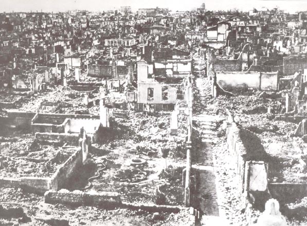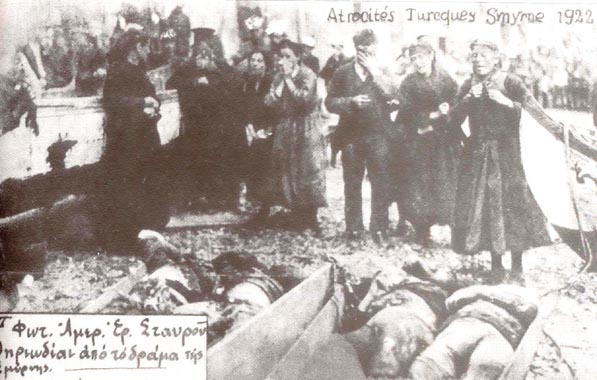 ![]() The English and French warships pour scalding water on swimmers approaching to climb aboard Now the life of our father was in danger, because they were gathering up the men. My father was 46 years old, and the age group which had been designated for capture was from 18-45. He appeared much younger, like a young bachelor. So, he had to do something to avoid being caught. We descended again to the wharf and saw the various war and merchant ships--English, American, French, and Italian--anchored at a distance from the shore. Our father says to us, "My children, I have to flee, because, if they catch me, I know I won't live. You, my daughter, you look like an old lady, and you, my son, are a young boy. So, they won't harm you. If they put you in a boat to send you from here, tell them that you want to go to Rhodes, because you have family there." He hugged and kissed us with bitter tears, and immediately pushed into the middle of the throng at the shore. Then he plunged into the water, and swimming, went to the French warship Ernest Renan. When he neared, he shouted to the officers and sailors, who saw him from the deck, and begged them to take him aboard. But they, hardhearted, motioned and shouted for him to leave. Grabbing the chains of the anchor, he persisted and begged. They answered by throwing boiling water down on him. The poor man, embittered, turned to head back. The distance was great, and being very tired, he almost drowned. Nevertheless, he succeeded in reaching the shore, and cried when he saw us. He hugged us and we cried together. Because he was soaking wet, my sister went to the wharf to search through the heaps of possessions for some clothes, so that he could change. She found a bundle of women's clothes and immediately thought to disguise him in women's garments. She brought them back and dressed him in along dress, stuffed a hump on his back, and covered his entire head, except his eyes, with a kerchief, and gave him women's shoes. So, we tried to take heart and went to sit near the destroyed buildings of the wharf, almost across from the "Doussou at bania" [Jardin de Bains near the Point?] There we met another man dressed as a woman who sat on the bare ground together with his wife and small children. He told us how he had tried yesterday to swim near the other French warship, the Waldeck Rousseau, and how the sailors had thrown boiling water down on him to make him leave. Lost on land, drowned at sea My father and my sister, who were both disguised as old women to hide their age and gender, sat down on the ground in a corner and didn't move from their places. But I, a 12-year-old boy, went around among the ruins out of curiosity. I went to the French Embassy, the marble-hewn building, on the pier. It was the only building in that area that, together with the Italian girls' school, they didn't burn. Next to the embassy was that magnificent building, the Theatre of Smyrna. It was burned and gutted. In the middle of the charred heaps were many burned corpses. These poor Romioi, they had gone in to hide, to flee the plunder and slaughter, with the hope that, because the building was attached to the French Embassy, the Turks would not set fire to it. Because the Turks saw many there, they shut them up inside and set fire to the building to burn them. What a horrible tragedy it was that has been recounted by people who saw it burn with their own eyes! From the Bella-Vista [Bella Vista Street] up to the customhouse, in one area of the wharf more than 2 kilometers in length, all the great centers, buildings, hotels, and rich mansions had burned. Indeed, the fire had destroyed the very foundation of the city, the entire sector in which were the Romiot quarters of Smyrna and the business center. Along the whole length of the shore, the sea was filled with drowned bodies. Everywhere in front of the Bella-Vista section there were so many drowned bodies, that, if you were to fall into the sea, you would not sink, because so many corpses would buoy you up in the ocean spray. You could see each corpse's swelled belly curving above the water. Some of these bodies were of people who, reaching the shore, were forced or thrown into the water by the pushing of the crowded masses. These masses had left their burning houses and run and thronged together at the shore to leave the hell of the fire. The water was deep here, too, more than 2 meters. But the floating corpses weren't just of these people whom the shoving had forced into the sea. There were those, too, whom the enemy, seeing them alive or seeing them deadit was all the same to themthrew them into the sea with hatred. And there were those who had fallen into the sea to escape the blade of the enemy. Some girls were pushed into the sea by their parents, just as the enemy had come to seize them.  From the drowned bodies they took whatever of value was on themThese lifeless bodies were of men, women, and children. Of course, all Romioi. . . . And I saw about a dozen Turkish youth who were swimming among those entwined carcasses to take whatever of value they had on them. I stood and watched. They had covered their noses with kerchiefs tied behind their heads so as not to smell the rotten stench of the carcasses. They carried with them pointed knives and, with a great display, cut off the corpses' fingers that had rings and the tips of ears with earrings to take the jewelry. They grabbed bracelets and whatever valuables were also hidden in throats. They even thrust their hands into the women's cavities where there was nothing hidden. As for the male corpses, they thrust their hands into the pockets of the waistcoats to find a watch with a fob (as was the custom among the Smyrniots), into the pockets of the jackets and trousers, for a wallet, for money, or for anything else of value. They were so greedy that they took off shoes from the corpses, suspecting that when the dead people were still alive, they had hidden in them someth