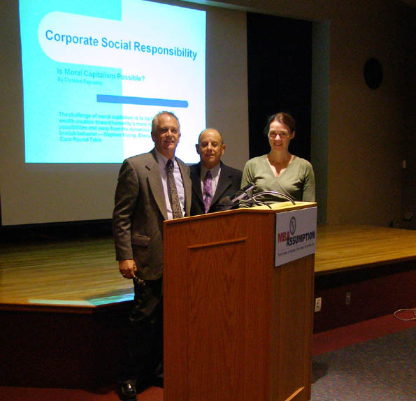 The Graduate School - Assumption College Hosted a Lecture by Christos Papoutsy on September 15, 2007 Papoutsy spoke to a capacity crowd of students, faculty and visitors from the community, business including representatives from Holy Cross. The theme of the lecture was: "Mission and Strategy for te Global Economy and a Sustainable Planet." The one hour lecturewas fllowed by a half hour of questions from the audience.  |