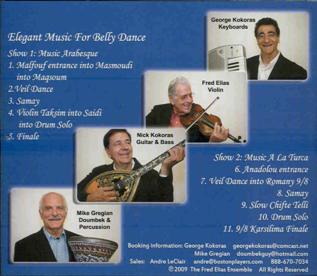 - "'Elegant Music for Belly Dance' is the result of 40 years of musical collaboration between Fred Elias, George and Nick Kokoras, and Mike Gregian. . . . It is a beautiful blend of traditional Middle Eastern modes and rhythms with original interpretations by these amazing artists!"--The Dancing Gypsy (http://massachusetts.tribe.net)
