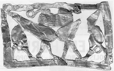 ![]() Ivory plaque adorned with scenes from the life of Achilles. Found in leather pouches hanging from iron nails. They were made in Egyptian workshops.  |