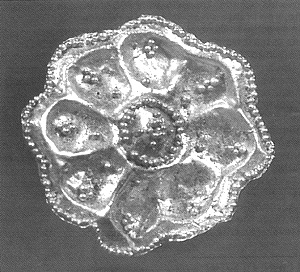 ![]() Gold rosette with granulated decoration. Together with four similar rosettes and eight silver plaquettes decorated with female heads, it formed part of a necklace or diadem interred with the dead woman in an urn burial in the Orthi Petra necropolis.  |