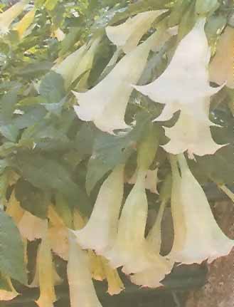 Flowering now/Perfect pot plant Bearing pendulous, narrowly trumpet-shaped, night-scented flowers to 30cm long, Angel's Trumpets' (Brugmansia sauveolens) is a showstopper. Belonging to the same family as the more pedestrian tomato and potato, Angel's Trumpets is a native of SE Brazil, where it grows in open forests up to 3,OOO-metre altitude, flowering from summer to autumn. It is a large evergreen hairless shrub to about 5 metres in height, the narrowly ovate leaves almost as large as the flowers which are usually white, though rarely pale yellow or pink. Widely cultivated in the tropics, sub-tropics and Mediterranean areas, there are many cultivars of B. sauveolens and these tend to be the most highly scented of all the Brugmansia, especially at night - in the wild its main pollinator are moths, guided to the nectar by the pale luminescent colour and powerful scent. One of the most floriferous of the genus is Brugmansia x candida and its cultivars.  |