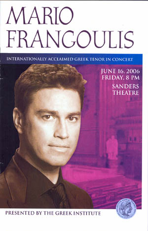Frangoulis has appeared with many notable superstars such as Alanis Morissette, Natalie Cole, Robbie Willilams, Diana Krall, Elvis Costello, and Sheryl Crow. Moreover, his acting background landed him a role in the biography of Cole Porter, De Lovely, which starred Kevin Kline and Ashley Judd.  Although born in Rhodesia of Greek parents, he was raised in Athens by an aunt and uncle who introduced him to music. He studied violin and acting in London, also attending London's Guildhall School of Music and Drama, and appearing in Les Miserables and The Phantom of the Opera. While at Guildhall, he won the Maria Callas Prize. His operatic studies took him to New York's Juilliard School of Music on a scholarship and later to such operatic legends as Alfredo Kraus and Marilyn Horne. In Greece, Mario has appeared—to much acclaim—in "everything from the role of high-school hero Danny Zuko in Grease to a production of Aristophanes' The Birds featuring the songs of Greek composer Manos Hadjidakis (the Oscar-winning composer of "Never On Sunday") in the ancient amphitheater at Epidaurus," writes Maria Anagnostopoulos, the Assistant Director of The Greek Institute. For this independent, non-profit institution, the sell-out concert at Harvard recalled echoes of another such successful performance at Sanders in 1998, the "Celebration of Greek Music in America" concert with 70 Greek and Near-Eastern musicians led by legendary Fred Elias and Chris Papoutsy. Accompanying Frangoulis was a 27-piece orchestra led by note conductor Michael Butterman. Currently the Music Director for both the Shreveport Symphony and the Boulder Philharmonic, he is also on the conducting staff o the Jacksonville Symphony and the Principal Conductor for Education and Outreach with the Rochester Philharmonic Orchestra. In great demand nationwide, Butterman has appeared throughout the country with many symphonies and orchestras. His work has been featured in nationwide NPR broadcasts and can be heard on CD's recorded for the Newport Classics label. Perfoming in the orchestra were Theodoris Oikonomou (piano), Rachel Braude (flute), Panagiotis Liaropoulos (synthesizer), Andrea Bonsignoire (oboe/English horn), Lisa Brook, Robert Curtis, Dana Ianculovici, Susan Faux, Olga Kouznetsova (all five violinists), Peter Cokkinias (clarinet), Emilian Badea (bassoon), Richard Given and Charles Lewis (trumpets), Don Drishnaswami and Jennifer Tanzer (both violas), Carolyn Cantrell and Nancy Hudgins (both French horns), Jan Pfeiffer and Beth Pearson (cellos), John Faietta (trombone), John Damian (guitar), Theodoulos Vakanas (bouzouki), William Manley and Mark Worgaftik (percussion, both), Blendi Dhamis (bass), Fred Buda (drums), and Martha Moor (harp).  |