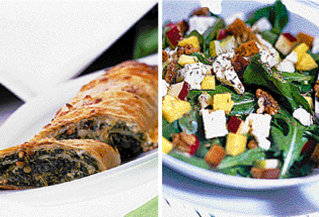 Boiled greens Ingredients 1 kilo wild greens (one type, like dandelions, or mixed) 1 tbs cold-pressed olive oil juice of 1 lemon 1 tsp salt Preparation 1. Clean greens: trim roots and pick out yellowed leaves. Rinse well under cold running water, shake, and drain in colander. 2. In a large pot, bring water to boil. When it reaches a rolling boil, add greens a handful at a time. Cook for about 10 minutes, then strain. Reserve some cooking water. 3. Place greens in a large salad bowl. Toss with olive oil, lemon juice, two tablespoons of cooking water, and season with salt. 4. Garnish with lemon quarters and serve. You can buy salad greens at a farmers' market or even pick them yourself in the countryside in late winter or early spring. To uproot, loosen soil with a sharp knife and lift out. Collect in a bag. Spinach roll  Spinach with feta