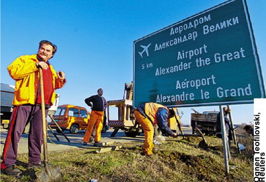 ![]() Workers put up a sign displaying the new name of the Former Yugoslav Republic of Macedonia's main airport, Aleksandar Veliki (Alexander the Great), near the capital Skopje, on January 16. Fyrom's decision to rename its main airport after the ancient Greek conqueror Alexander the Great, added fuel to a 15-year-old dispute with neighbouring Greece over the former's name  |