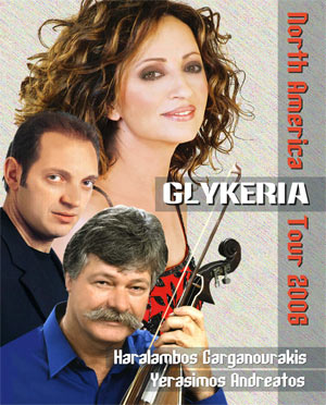 She began her career in 1974 working in the Athens Plaka music ‘boites’ and gave performances with well-known artists, singing songs by M. Hadjidakis, M. Theodorakis, M. Loizos and others.  Discography: 1978 “Min kanis onira” (Stop Dreaming); 1980 “Sta matia kita me” (Look me in the eye), “Smyrneika”; ‘Apo ti Smyrni ston Pirea” (From Smyrni to Pireaus); “Me ti Glykeria stin Omorfi Nychta” (With Glykeria at Omorfi Nychta); “Tragoudi esthimatiko” (Sentimental Song); “Matia mou” (Sweetheart); “Me panselino” (Under the full moon); “Volta stin Ellada” ( A(A trip round Greece); “Ola mou ta mystika” (All my secrets); “Ximerosse” (Daybreak); “Chora ton Thavmaton” (WonderlandLand of Traumas); “Se mia schedia” (On a raft); “I Glykeria tragouda Antoni Vardi” (Glykeria sings songs by Antoni Vardis); “Maska” (Mask); “Glykeria  Charama 2000” (Glykeria  Daybreak 200); “Ta rebetika tis Glykerias” (Rebetika); “Glykeria  The voice of Greece”; “Dekapentavgoustos” (15th August); “I agapi irthe apo makria” (Love came from afar), etc.