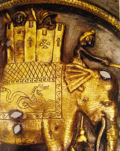 ![]() A Greek ketos, or sea monster, on the saddle cloth of a war elephant on a gilt silver disc from central Asia  |