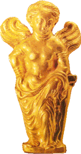 An ornament discovered in Tillya Tepe shows an almost pure Aphrodite. But she is a little odd - she has wings and what we would call a caste mark on her forehead. This urna was a sign of importance or divinity, which seems to have originated in Central Asia and was soon to be applied to the figure of the Buddha and others once Greek art had persuaded the east that their man-god deserved an image in the likeness of a Greek god.  |