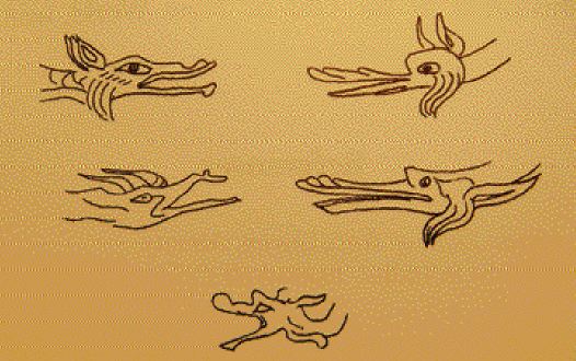 ![]() Various renditions of the Greek ketos (R), copied in pencil by the author, and of the Chinese dragon (L)  |