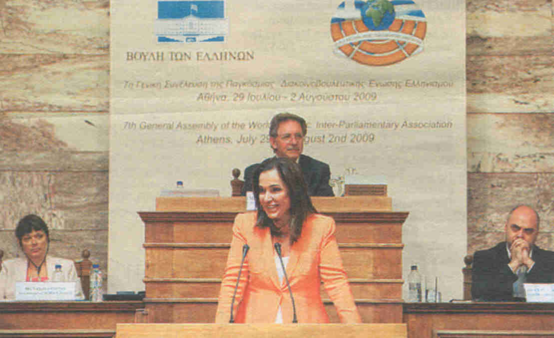 ![]() ![]() Foreign Minister Dora Bakoyannis addresses the opening session of the World Hellenic Inter-Parlimentary Association's general assembly  |