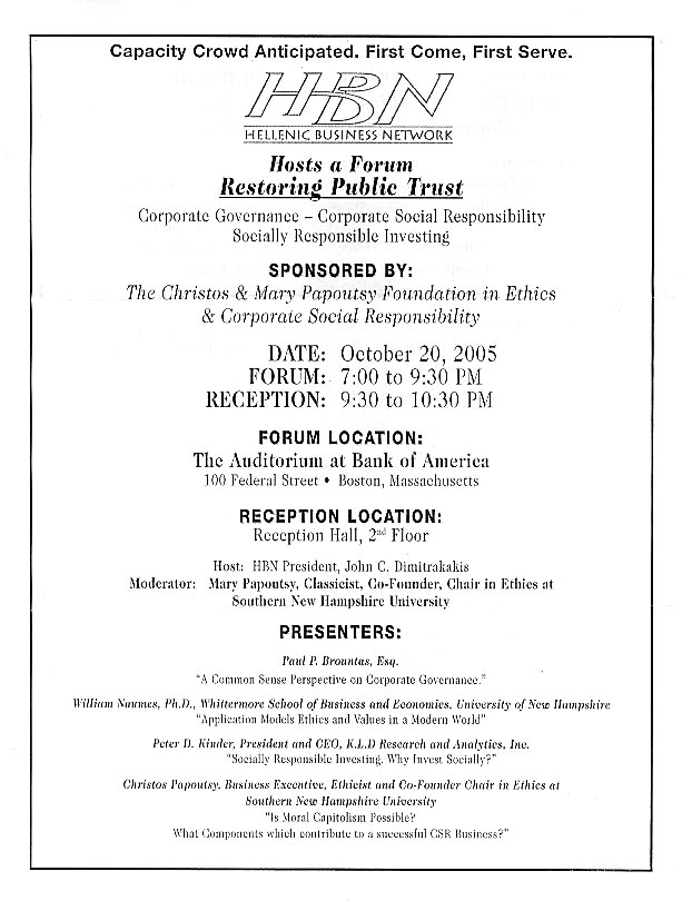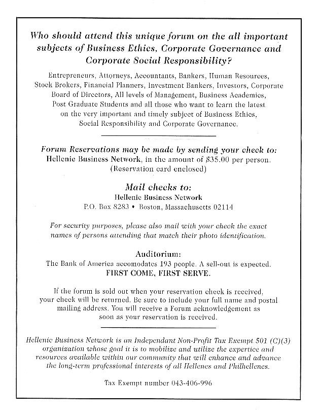 ![]() Hellenic Business Network (HBN) is an independent nonprofit, tax-exempt 501(c)(3) organization whose goal is to mobilize and utilize the expertise and resources available throughout the community that will influence and advance the long-term professional interests of all Hellenes and Philhellenes. Fore more information about Hellenic Business Network, the host of the upcoming ethics forum, visit the organization's website at the URL http://www.hbngroup.org or contact them at 888-251-5568. For more information about the Christos and Mary Papoutsy Charitable Foundations, see the About Us section of Hellenic Communication Service at the URL http://www.helleniccomserve.com/aboutus.html or at the URL for the academic chair in ethics at Southern New Hampshire University (http://www.snhu.edu/papoutsy.html). Readers interested in the topics of ethics, and especially business ethics, may wish to read other articles in the extensive, permanent archives of HCS under the Business Ethics section (http://www.helleniccomserve.com/contents.html#Business Ethics).  |