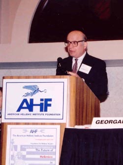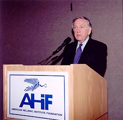 Mr. Manny Rouvelas, in his speech "Engaging Greek American Professionals," identified the problem of social disengagement from the community as a broader social phenomenon but he stressed that Hellenic identity can provide the solution, "due to its variety and richness." Mr. Rouvelas stressed that "we define Hellenism very narrowly; we confine it with everything being Greek" while the idea of Hellenism is much broader and represents a certain process of thinking that involves the notion of choice to engage in the community. Thus the key issue is to provide the incentives for professionals to engage, not do it out of obligation. During the discussion period the audience had the opportunity to ask questions which ranged in scope from the relationship between Greek Americans and Greece to the role of the Greek Orthodox Church. During his luncheon address, Dr. John Brademas provided an overview of the achievements that Greek Americans have accomplished in various areas of the American political, economic and social spheres and made insightful suggestions of how to enhance the educational ties between the U.S. and Greece. He suggested the advancement of programs on Hellenic Studies in various universities, support more cultural events that promote Greek artists and the establishment of endowments and chairs on Hellenic Studies in prominent universities. Benefactors who helped make the AHIF's conference possible include: Peter G. Angelos (Baltimore, MD); Nicholas Bouras (Summit, NJ); Dr. James Faller (Wilmington, DE), Elias P. Gyftopoulos (Lincoln, MA); James and Nike Lagos (Springfield, OH); James S. Nicholas (East Grand Rapids, MI); James Pedas (Washington, DC); Theodore Pedas (Washington, DC); Gene Rossides (Washington, DC.) Digital photographs from the 2nd Annual AHIF's conference on The Future of Hellenism in America are available upon request. Please contact Angeliki Vassiliou at (202) 785-8430 or at angeliki@ahiworld.org for additional information on the conference. For general information about AHI, please visit our website at http://www.ahiworld.org.  |
