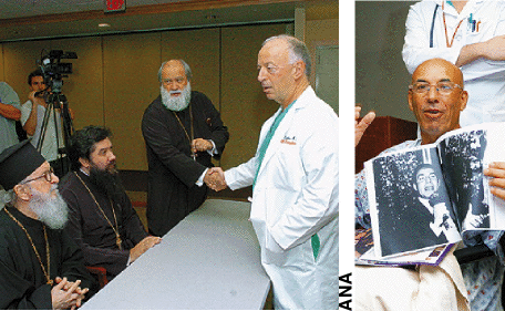 ![]() Transplant surgeon Andreas Tzakis, who heads a clinic at Jackson Memorial Hospital in Miami, Florida, briefs Archbishop Demetrios of America (Left) and other bishops about Archbishop Christodoulos' failed surgery on October 7. Jacob Girshon (R) received the liver transplant originally intended for Christodoulos  |