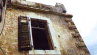 A kitchen is located in the northeastern room. Almost all the wooden doors and the windows have fallen apart, half rotten. The bathrooms were sheltered on the north in a separate outhouse that has since crumbled. Some special architectural characteristics stand out among the stone-hewn weighty walls: brown-colored, projecting cornerstones of equal size, just like the foundation stones, offer a contrast to the walls of the lighthouse, as well as to the white marble framing the doors and windows. The square tower, of the same construction as the central building, has a height of 11 meters. One of the most remarkable features of the lighthouse is an astonishing marble spiral staircase composed of wedge-shaped marble steps that form the center of a cylindrical column. The stairs lead to the top of the lighting machinery that has been abandoned today to bats whose droppings have covered the topmost steps. The square tower ends in a metal cage (housing for the light).