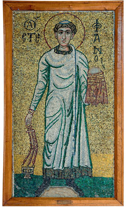 | (Images above: [left] Unknown artist, Mosaic icon of Saint Stephen, c. 1108–1113. Tesserae on stucco, 218 x 118 x 7 cm. National Conservation Area St. Sophia of Kiev; [right] Unknown artist, The Khludov psalter, 857–865. Parchment, ink, cinnabar, gold painting, tempera, wood and leather, 21 x 17.5 x 6 cm. The State Historical Museum, Moscow, Russian Federation, GIM 86795 Khlud. 129, fol. 67r. Photo © The State Historical Museum.) The exhibition shows the long history of Byzantine art and documents the patrons and artists and the world in which they lived. Seeing themselves as the members of a Christian Roman Empire they believed that they represented the culmination of civilisation on earth. The art emits an intellectual, emotional and spiritual energy, yet is distinctive for the expression of passionate belief and high emotion within an art of moderation and restraint.  |