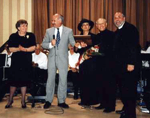 Manchester, NH--On Saturday, May 18, 2002, St George Greek Orthodox Cathedral hosted a successful annual evening dinner-dance at its facility in Manchester. A capacity crowd dined on sumptuous Greek cuisine and pastries and listened with great enthusiasm to the sophisticated sounds of the 25-piece Hellenic and Near Eastern Musical Society Orchestra. Led by former Cathedral parishioner Christos Papoutsy, the orchestra received a standing ovation for its fine musical contribution to the affair. Current parish president and chairman of the event, Mr. George Copadis, presented Mr. and Mrs. Papoutsy with a plaque, on behalf of the entire cathedral community, honoring their "philanthropic and dedicated service to promoting and preserving the Greek Orthodox culture and heritage."  |