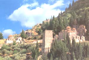 | Under the bright sun, the ruins of the Byzantine town of Mystras radiate a mysticism other places are capable of only in the moonlight. This steep, rocky hill at the foot of Mount Taygetos is covered with; churches and the remnants of palaces and homes. A collection of ruins amphitheatrically spread among cypresses and pines, the hill had for centuries enchanted travellers, even inspiring visions and hallucinations. It is bound to impress you too, even in this age where the silence is intermittently disturbed by tourist crowds. The slope of the rocky mass dominating the Sparta plain is heavy with history, legends and symbols. Yet the town's dramatic past is little known, not only abroad but also in Greece. In the narrow alleys of the castle-town, the flame of Byzantium kept illuminating the Greek world in an era of rapid decay. Here, the Modern Greek national conscience was born. |