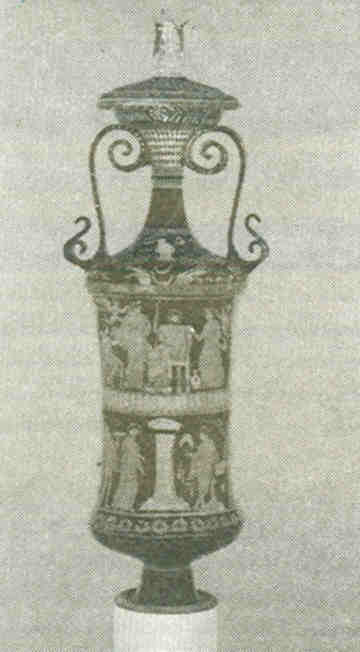 ![]() Loutrophoros (ceremonial vase for water) with male deity between Persephone and Aphrodite. Greek, South Italian, Apulian, Late Classical, red-figure, ca. 340-330 B.C. Attributed to the Darius Painter. Terracotta, h. 36-5/8 in. (93cm). The Metropolitan Museum of Art, Rogers Fund 1911 (11.210.3a.b)  |