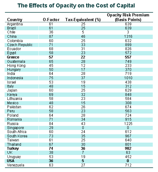 This overall exercise created three streams of related data: 1) the O-Factor scores, 2) measurements of the risk premium attributable to opacity when countries borrow throuhg sovereign bond issuances in international or domestic capital markets, and 3) calculation of the effects of opacity as if it imposed a hidden surtax on foreign direct investment (FDI) -- a tax payable not to a government but, more obscurely, levied by and lost in the weave of opaque business practices. In a short time, we plan to publish a fourth data set, estimating the extent to which opacity deters foreign direct investment. This is an area of great interest and considerable complexity. The PricewaterhouseCoopers Opacity Index, launched in January 2001, provides a new measure of the effects of corruptoin on the cost and availability of capital (the cost of borrowing funds), in a number of countries. The Opacity Index offers a composite "O-Factor" for each country, based on opacity data in five different areas that affect capital markets: a) corruption, b) legal system, c) economic and fiscal policies, d) accounting standards and practices (including corporate governance and information release) and regulatory regime. From these elements a useful acronym, CLEAR, emerges as a means of keeping in mind the multiple aspects of opacity/transparency in capital markets. The O-Factor and related data on real yet unnecessary costs should encourage countries and businesses to promote more transparent practices in the five CLEAR areas. Conclusion: As the world's markets, in the era of "globalization," become more interdependent, it becomes obvious that one country can differ from another in the clarity and consistency of their approaches to managing their economies. Some national economies are relatively transparent, while many others are relatively opaque. The PricewaterhouseCoopers Opacity Index brings a degree of clarity to the subject of costs related to corruption. Supporting data may be viewed and downloaded by logging onto http://www.opacityindex.com/ind_whatwhy.html.