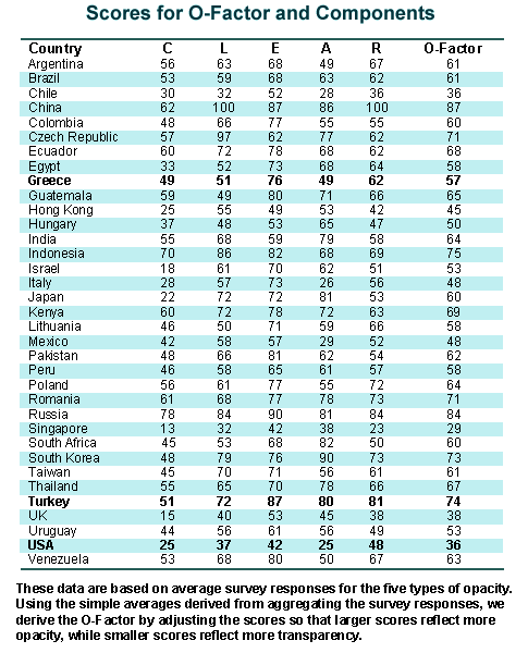 O-Factor is the score of a country based on the survey responses.   High numbers indicate a high degree of opacity, and low numbers indicate a low degree of opacity.