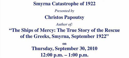 | (Rye Beach, NH)--Author Christos Papoutsy will discuss his book, Ships of Mercy, at the American Hellenic Institute in Washington, DC on Thursday, September 30, 2010 as part of the Institute's annual commemoration of the Catastrophe of Smyrna. Members of the public are invited by both the author and the Institute to attend; reservations may be made by phoning the Institute. Copies of the author's book will be available for purchase. Light refreshments will be served. Additional details can be viewed on the event flyer below. Remembrance of the Mikrasiates yearly in September has been a traditional cultural event for Greeks in Greece and for Greeks of the Diaspora. Nearly every family in Greece today can count some connection to Asia Minor, since the population of Greece increased by 25% in 1922 after the massive influx of refugees from Turkey, affecting refugees and mainlanders alike. Some families chose to remain in Greece, struggling desperately to survive from day to day, while others opted to chance new lives abroad. But the refugees have never forgotten the tragedies and horrors of that time, passing along to children and grandchildren accounts of their harrowing escapes or of witnessing the heinous deaths of loved ones, friends, and neighbors. The Catastrophe of Smyrna is about ethnic cleansing and genocide, about acknowledging history and about confronting the tragedies of the past in order to move forward. Papoutsy has uncovered through his research new material that should be incorporated into the Greek-American dialogue on the tragedy of Smyrna: the role of Asa Jennings, an American hero. Jennings, nearly single-handedly, was responsible for saving the lives of over one million Greek and Armenian refugees from Asia Minor in 1922-1923. Ships of Mercy details the setting of the Catastrophe and the role of Jennings in securing safety for the Mikrasiates. For more information about the book, see http://www.helleniccomserve.com/pdf/SmyrnaFlyerWebcolor808.pdf. Copies of the book can be ordered online from major distributors. A Greek-language edition has been produced by Kastaniotis Editions of Greece, available through the publisher or Enfield Distribution Company.  |