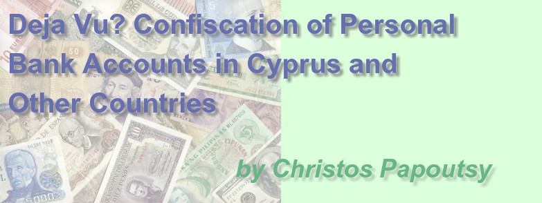 Cyprus has already considered an outright seizure of a percentage of private monies, labeling this measure a tax to raise desperately needed funds as part of its package of agreements with European Union officials. Vociferous public outrage caused the government to hesitate initially.  But a severe monetary crisis forced officials to implement a modified version of their original plan. Just as in the 1920s in Greece, there were significant international implications, repercussions that have begun to reverberate throughout the entire Cypriot economy.  Many foreigners, a large number of them businessmen from Russia, will be adversely affected and may opt transfer their businesses and holdings to other countries, amplifying the deleterious effect of the measure.