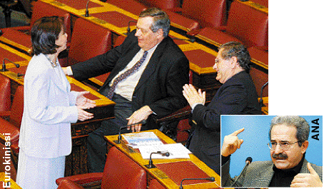 12 February 2004: Four days after more than one million Pasok faithful voted him party president, George Papandreou triggers another torrent in the ruling socialist party ranks with his surprise recruitment of two maverick neoliberal defectors from the conservative New Democracy opposition. Papandreou granted former ND ministers Stephanos Manos (C) and Andreas Andrianopoulos two of the six preferential seats on the party's 'statewide' ticket ahead of the general elections on March 7. Papandreou's decision effectively gave the two conservatives a free ride on the statewide ticket, where their seats in the new parliament were virtually guaranteed on the  |