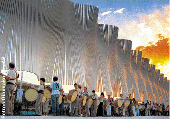 August 2004: The sun sets over a huge wind sculpture, The Wall of Nations, in the OAKA Olympic Complex in Athens while hundreds of volunteer drummers prepare for a dress rehearsal of their act at the opening ceremony of Athens 2004 Olympic Games, due a week later on August 13. Athens managed to finish its Olympic works in the nick of time, even as athletes, officials and journalists began to arrive at the airport. The transport network was finally up and running, the stadiums were ready and even landscaping efforts were nearly complete.  |