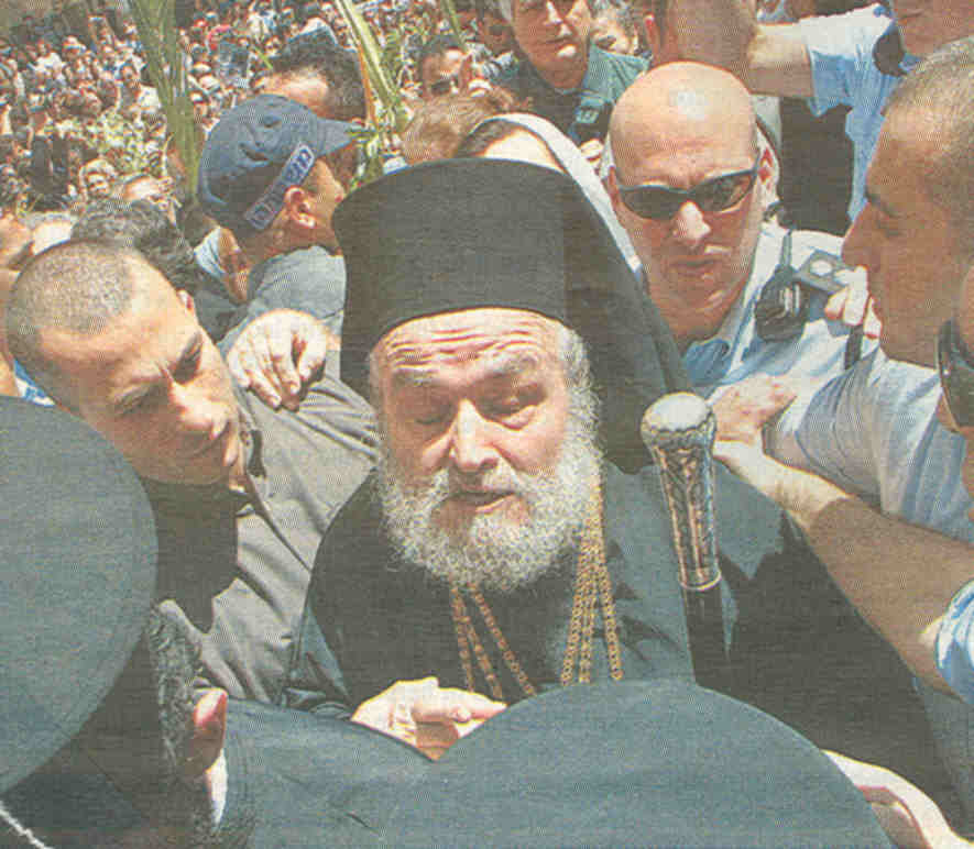 5 May 2005: A long-brewing schism at the Greek-Orthodox Patriarchate of Jerusalem breaks out into the open shortly after Easter celebrations, as over a dozen bishops denounced Patriarch Eirinaios (photo) on May 5 and declared they no longer recognise his official acts. The rebellion came on the heels of incontrovertible proof that Eirinaios' advisor had leased church property at the Jaffa Gate in the Old City of Arab East Jerusalem to Jewish investors, sparking the outrage of Arab Christians in the Holy Land. Some Israeli journalists believe a branch of the Israeli state leased the land, namely the Himnuta company, a subsidiary of the Jewish National Fund, working through an offshore  |