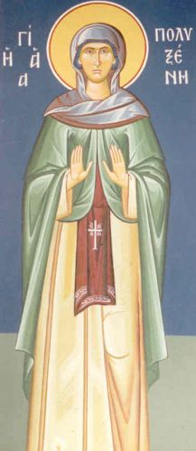 Unfortunately, there is no entry for St. Polyxeni at "The Lives of the Saints," nor are there any icon images for reference. But the websites of several iconographers (such as for the icon above right) offer myriad images for researchers and interested persons.