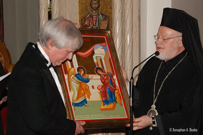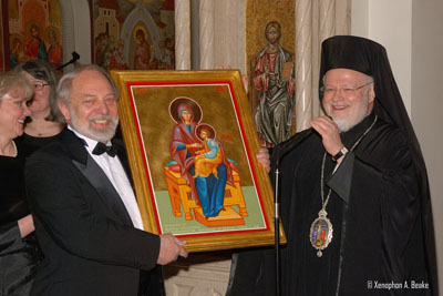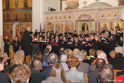 | BROOKLINE---Metropolitan Methodios and two large appreciative audiences from the Greek Orthodox Community of New England and the community-at-large were inspired and enthused during two performances of Rachmaninoff’s The Liturgy of St. John Chrysostom presented Saturday evening and Sunday afternoon by the Rachmaninoff Festival Choir and the Down East Singers & Bowdoin Chorus at the Annunciation Cathedral of Boston.  The concerts were presented in honor of Metropolitan Methodios’ 25th Anniversary to the Episcopacy.  Following the performances everyone enjoyed a reception in the Cathedral Hall.  Guests had the opportunity to express their appreciation for Metropolitan Methodios’ visionary leadership and to offer their best wishes. |