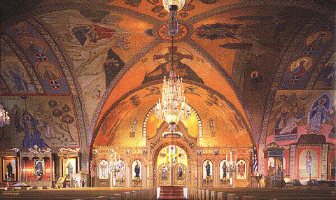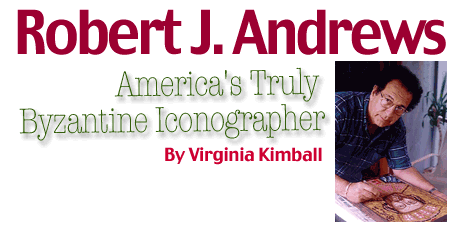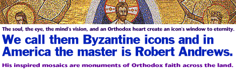 The soul, the eye, the mind's vision, and an Orthodox heart create an icon's window to eternity.  We call them Byzantine icons and in America the master is Robert Andrews.  His inspired mosaics are monuments of  Orthodox faith across the land.  In 1972, Archbishop Iakovos viewed the new Resurrection icon at Holy Trinity Church in San Francisco, California -- a 16 by 50 foot mosaic located in the apse. He wrote to Andrews: "We were very pleased with your mosaic of the Resurrection, which is your design and creation, and which is one of the finest examples of art we have seen in any of our Churches in the Western Hemisphere."  |