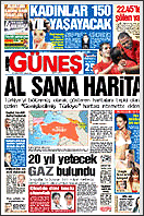| The ultranationalist frenzy in Turkey that is menacing the Kurkish people in an accelerated pace, and thus also ethnic and religious minorities, is now accompanied by a new expansionist campaign showing a Turkish occupation of the entire republic of Armenia and of Cyprus and also a part of the territories of countries like Greece, Syria, and Iraq. One of the daily Turkish newspapers with a large circulation, Gunes, published in its 21 November 2007 edition, a new map of Turkey demonstrating the annexation of these neighboring countries and territories under the title "You say map? Here's a map!" The newspaper announced that this map of an "enlarged Turkey" is actually circulating on the Internet in reply to maps showing a divided Turkey.  |