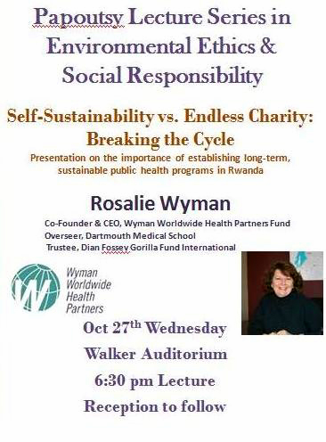 (Rye Beach and Manchester, NH)--Professor Michele Goldsmith, current holder of the Christos and Mary Papoutsy Distinguished Chair in Ethics at Southern New Hampshire University announced recently that the first lecture sponsored by the chair endowment would be delivered by Rosalie Wyman, renowned expert in health-care. CEO and co-founder of Wyman Worldwide Health Partners and an Overseer of Dartmouth Medical School, Wyman will discuss the importance of establishing long-term, sustainable public health programs in Rwanda as part of global efforts to break cycles of poverty. Scheduled at 6:30pm at Walker Auditorium on the university's flagship Manchester campus, the lecture is rfree and open to the public. A reception will follow immediately afterward. For more information, contact Jane Yerrington at SNHU (603-668-2211 x2488), or view and download the event flyer below.