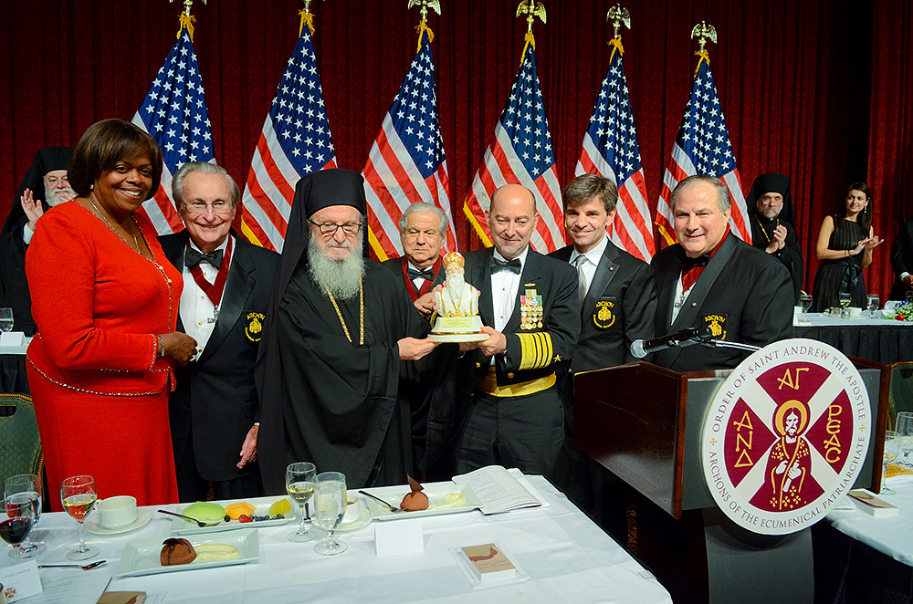 Archbishop Demetrios, in his response, congratulated "the admirable Admiral" for a "well deserved honor," and conveyed the blessings of Ecumenical Patriarch Bartholomew to the Order of Saint Andrew, to the honoree and the all those present at the banquet. The Archbishop said that from the days of Marathon and Salamis to the days of World War II and the invasion of Greece by the Axis armies, the Greek example of military conflict is one of people, small in numbers, who resist submitting themselves and their country to much larger foreign threats and occupation. His Eminence also noted that when Admiral Stavridis' parents were leaving their ancestral land for America they were carrying with them two important and symbolic items: the father, his academic college diploma and the mother, a treasured icon of Saint George, items representative of education and faith. Archbishop Demetrios added that in Admiral Stavridis, as a person, there is a convergence of the ancient Greek traditions and the Hellenic ideals with the witnessing of Christianity and the Orthodox tradition and martyrdom exemplified by many of our Saints and Martyrs, who served in the military service in their time.  |