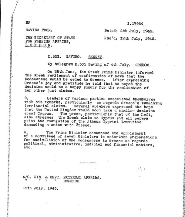 In a brief document (below), the Dominions Office in London notified the Australian Government on July 4, 1949 regarding Greek claims to the Dodecanese Islands and the Cyprus. As a result of the Italo-Turkish war, Italy ‘temporarily’ occupied the Dodecanese Islands under the Treaty of Ouchy signed in October 18, 1912. The Italians were to assume full sovereignty of these islands under Article 8 of the secret Treaty of London of April 26, thus joining the Entente-Britain, France and Russia- during the First World War.