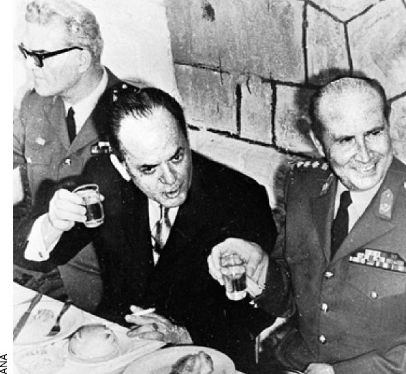 ![]() Coup leader Colonel George Papadopoulos (C) makes a toast with his feared cheif of the military policce, Bridadier Dimitris Ioannidis (R), and Lieutentant- General Phaidon Gizikis. Both men would betray him after the Polytechnic uprising, with disastrous results for Greece. His popularity weakened by the loss of life, Papadopoulos was ousted in November 1973 by Ioannidis and Gizikis was installed as president. The following year Ioannidis tried to assassinate Cypriot President Archbishop Makarios, prompting the Turkish invasion of the island  |