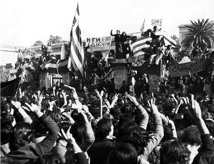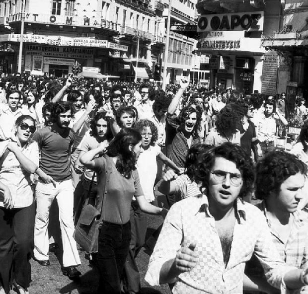 ![]() Students protest against the junta in the streets of Athens in the days before the Polytechnic massacre  |